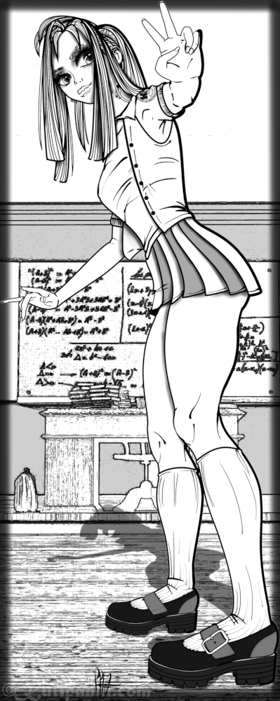 Frente a la pizarra.